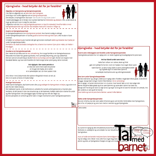 “Forældreinfo – hjemgivelse” er en kort pjece, der forklarer “jer som forældre”, hvad en hjemgivelse og en hjemgivelsesperiode betyder i praksis og hvad der bliver vigtigt i den næste tid.